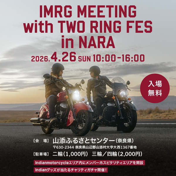 2026年最初のIMRGミーティングはバイク好きが旅をしながら集まり、様々な出展、グルメを通して交流できるフェスティバル『TWO RING FES』との併催で開催します。IMRメンバーエリアを設置し、Newモデル展示、記念撮影、大好評のチャリティーガチャ、スタンプラリー帳への押印、記念ノベルティー、ドリンクサービスなどなどホスピタリティーをご用意。
